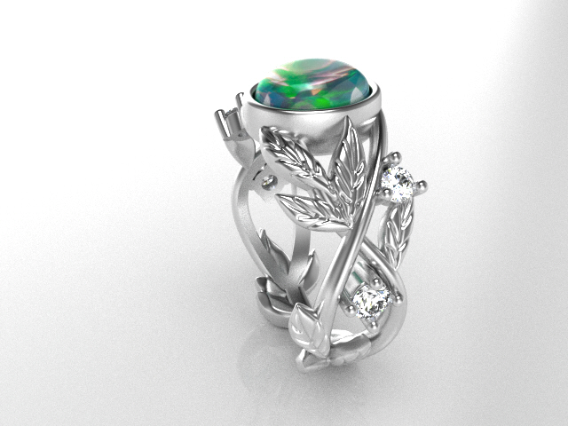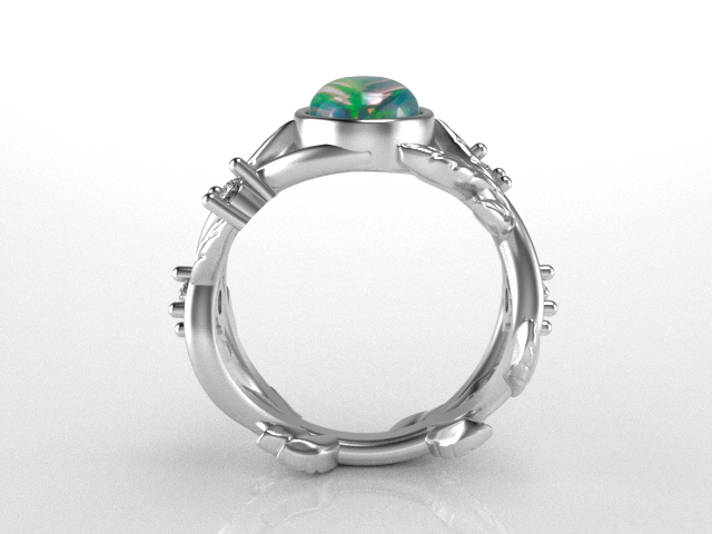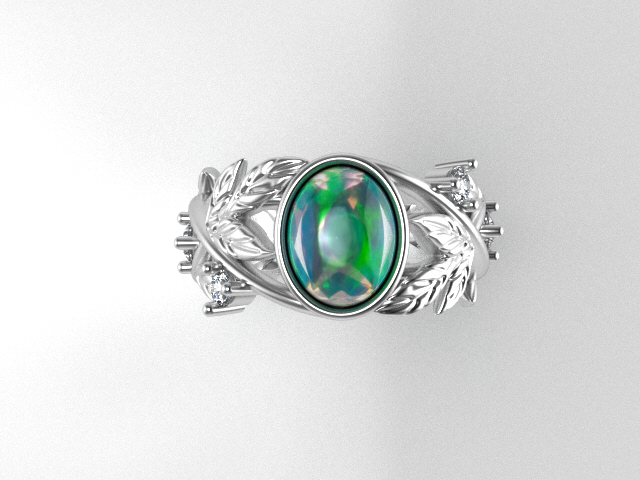 One ladies 14 karat white gold genuine opal and natural diamond engagement ring. The ring contains one oval shaped bezel set opal measuring 9.0 x 7.04 x 3.80 mm, weighing 1.50 carats. Prong set in the shank of the ring are a total of (4) round brilliant cut diamonds consisting of (2) measuring 2.90 mm and (2) measuring 2.50 mm weighing a combined 0.29 carats. All of the diamonds are colorless (F) in body color, and are VS in terms of clarity. The shank has a leaf motif design and is a one of a kind Ice River Diamonds design weighing 6.90 grams. R4426.