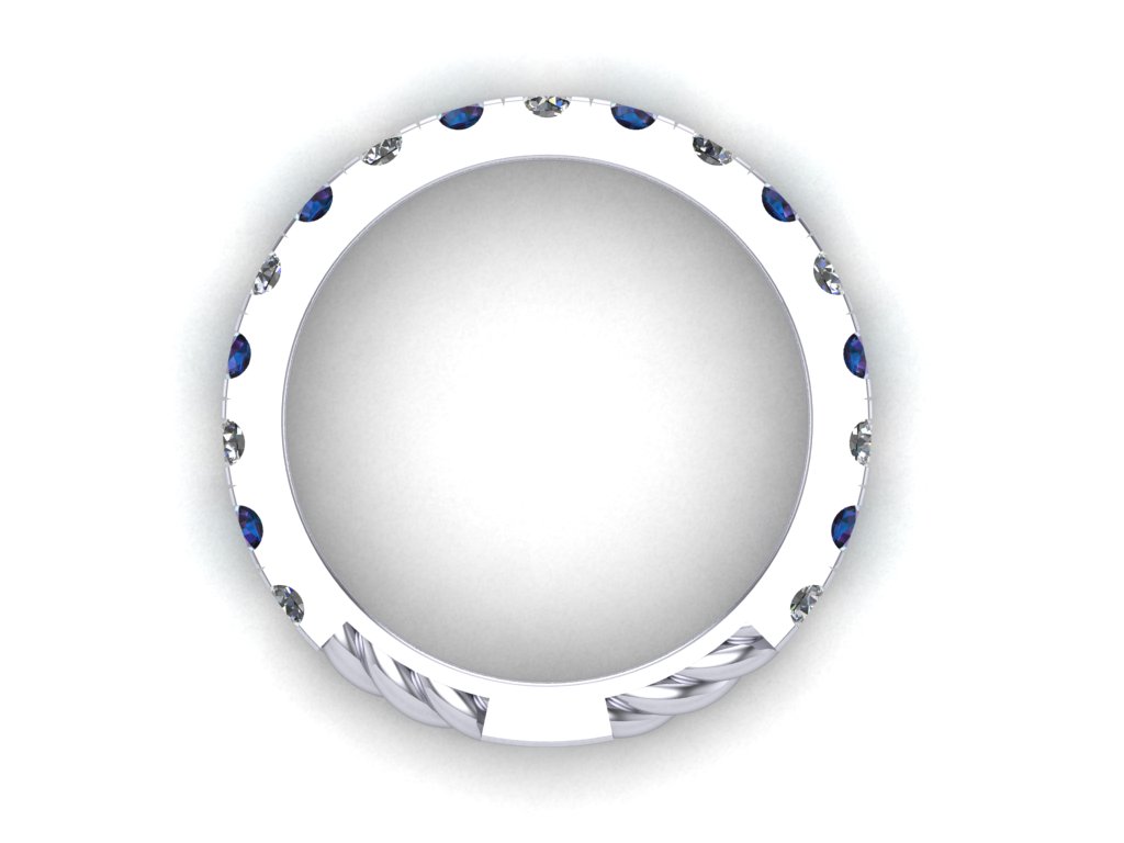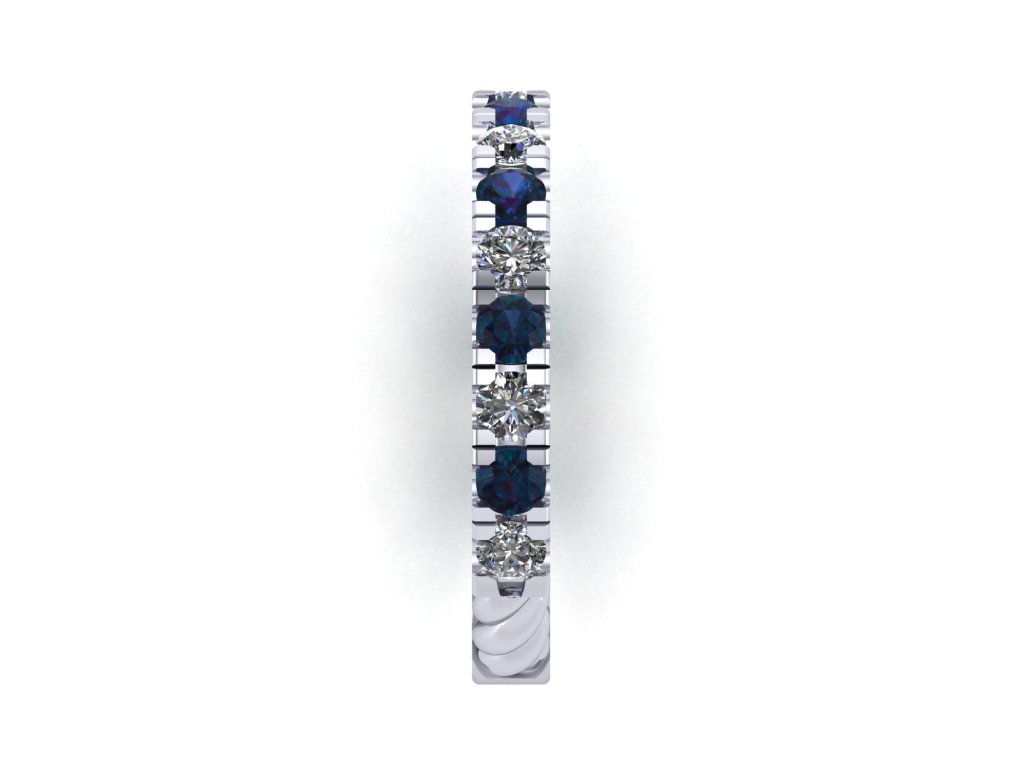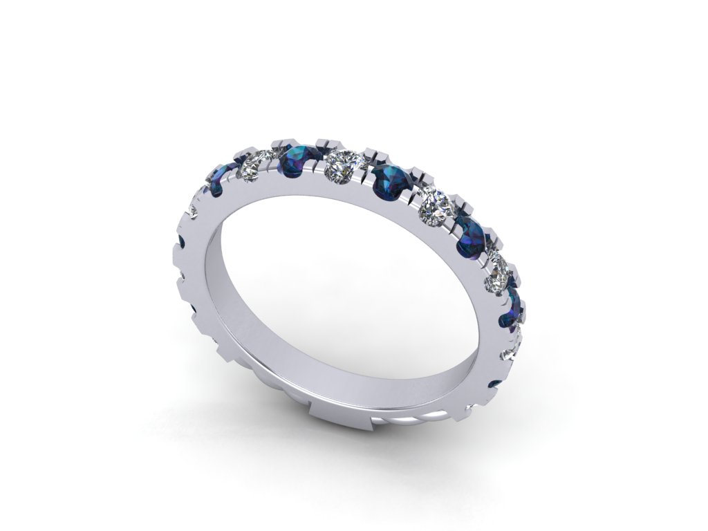 One ladies platinum wedding band. The ring contains a total of (9) round brilliant bead set diamonds measuring approximately 2.50 mm each, weighing a combined 0.53 carats. All of the diamonds are colorless (F) in body color, and are VS in terms of clarity. In addition to the diamonds are a total of (8) round brilliant lab grown alexandrite gemstones measuring approximately 2.50 mm each, weighing a combined 1.08 carats. These stones are bead set in an alternating pattern with the diamonds. The ring is a one of a kind Ice River Diamonds design weighing 5.70 grams. R4428