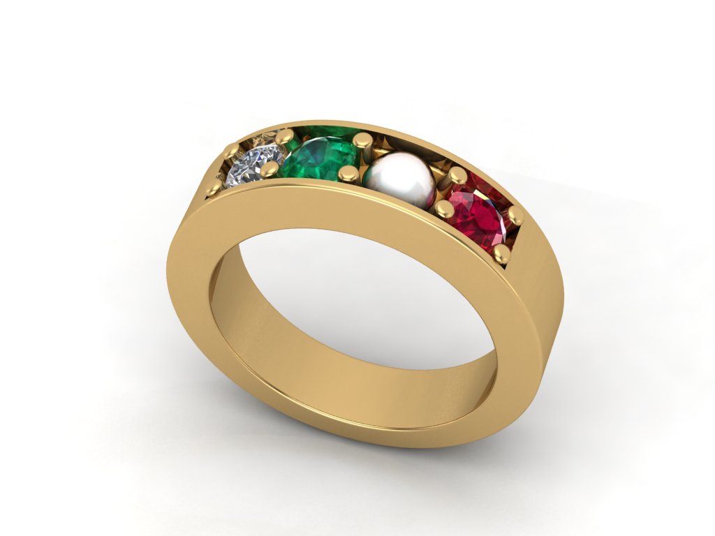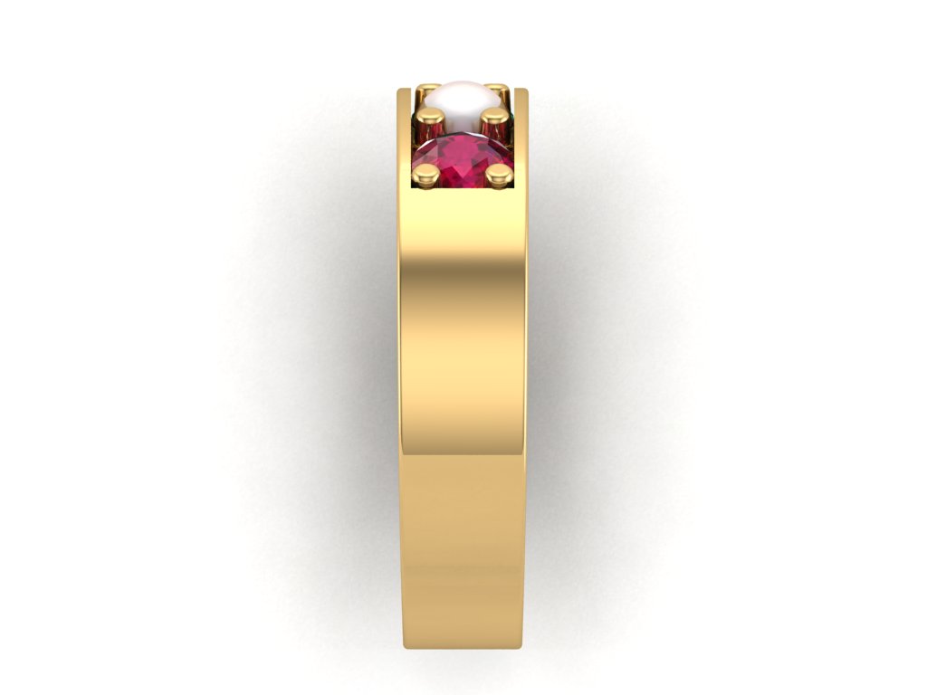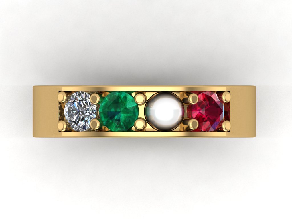 One ladies 18 karat yellow gold anniversary ring. The ring contains (3) 4.00 mm round brilliant cut Natural gemstones described as follows. One vivid red ruby weighing 0.31 carats, one vivid green emerald weighing 0.20 carats, and one round brilliant cut diamond weighing 0.25 carats. The diamond is colorless (F) in body color and is VS in terms of clarity. There is an additional round 4.00 mm Natural pearl set along with the other gemstones. The ring is a one of a kind Ice River Diamonds design weighing 10.8 grams. R4427.